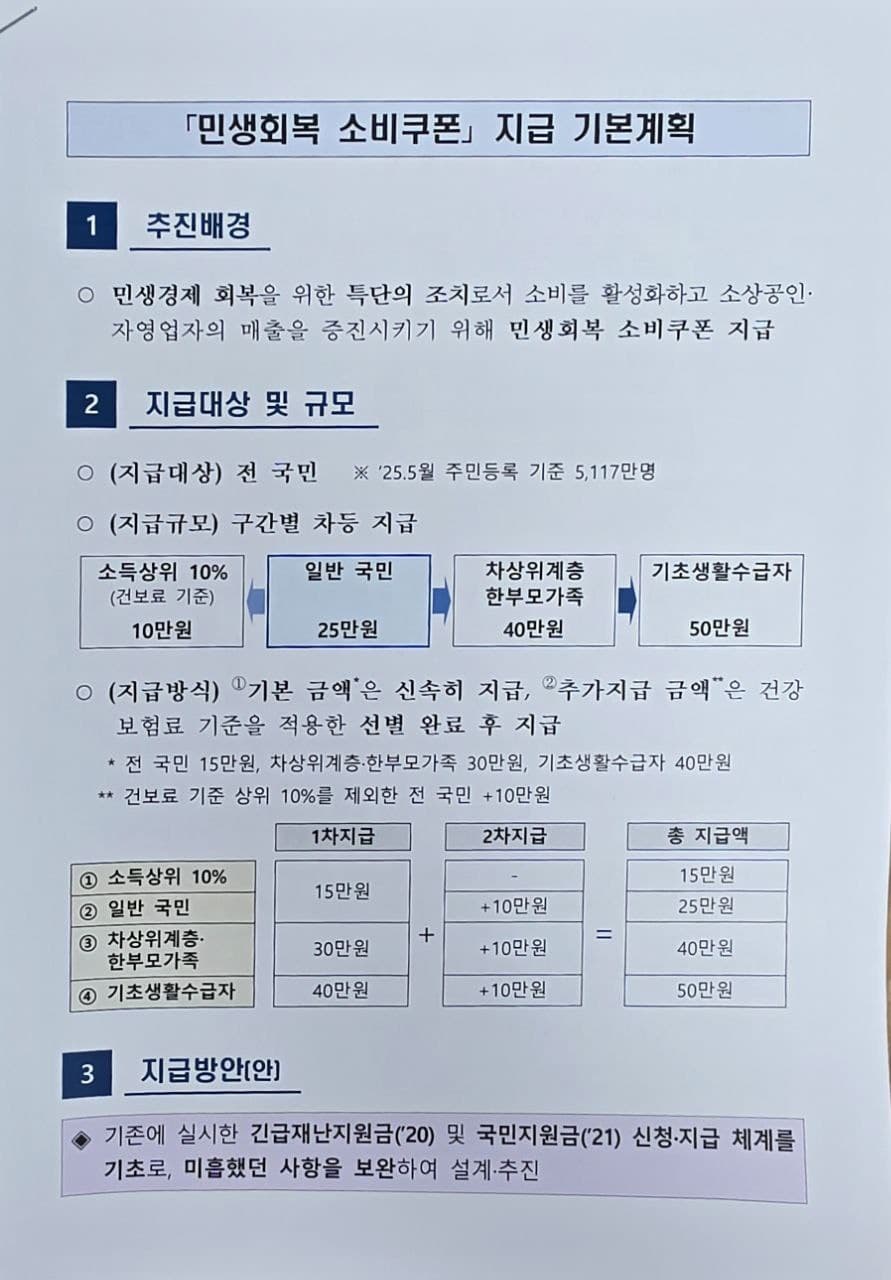특히 이번에는 차등지급 방식을 검토 중이며, 기초생활수급자는 최대 50만원, 일반 국민은 25만원 수준으로 소득 수준에 따라 지급액이 달라질 예정입니다.