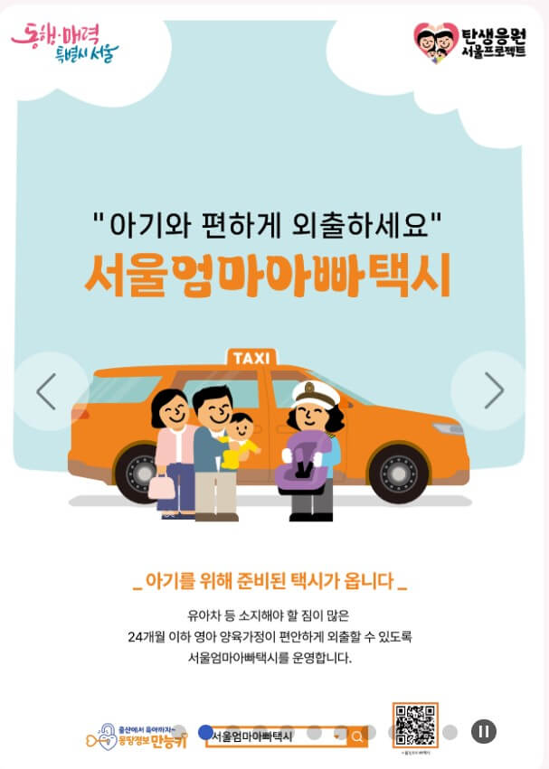 ‘서울엄마아빠택시’는 서울시에 거주하며 24개월 이하의 영아를 양육하는 실질적 보호자에게 영아 전용 카시트 탑재 택시 이용권(포인트)를 제공하는 제도입니다.